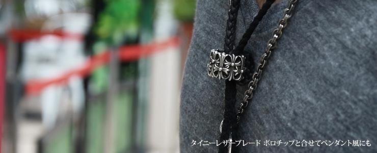 また、タイニーレザーブレード スクロール ボロチップ(革紐ネックレス)などと合わせれば、ペンダントトップにも使える優れものです。使い方次第で、リングにも、ネックレスにも使えるファッション性の高いアイテムです。