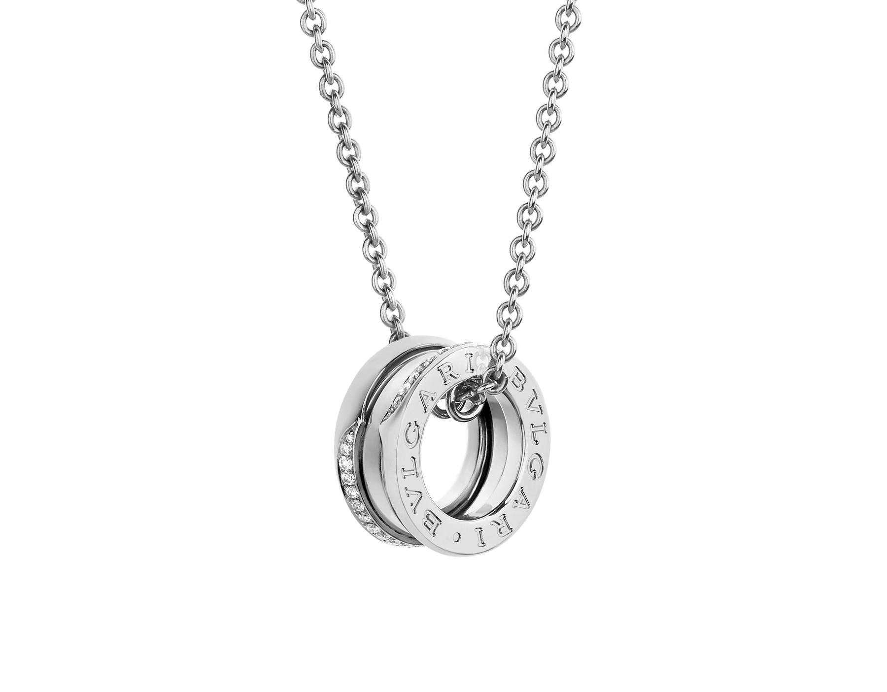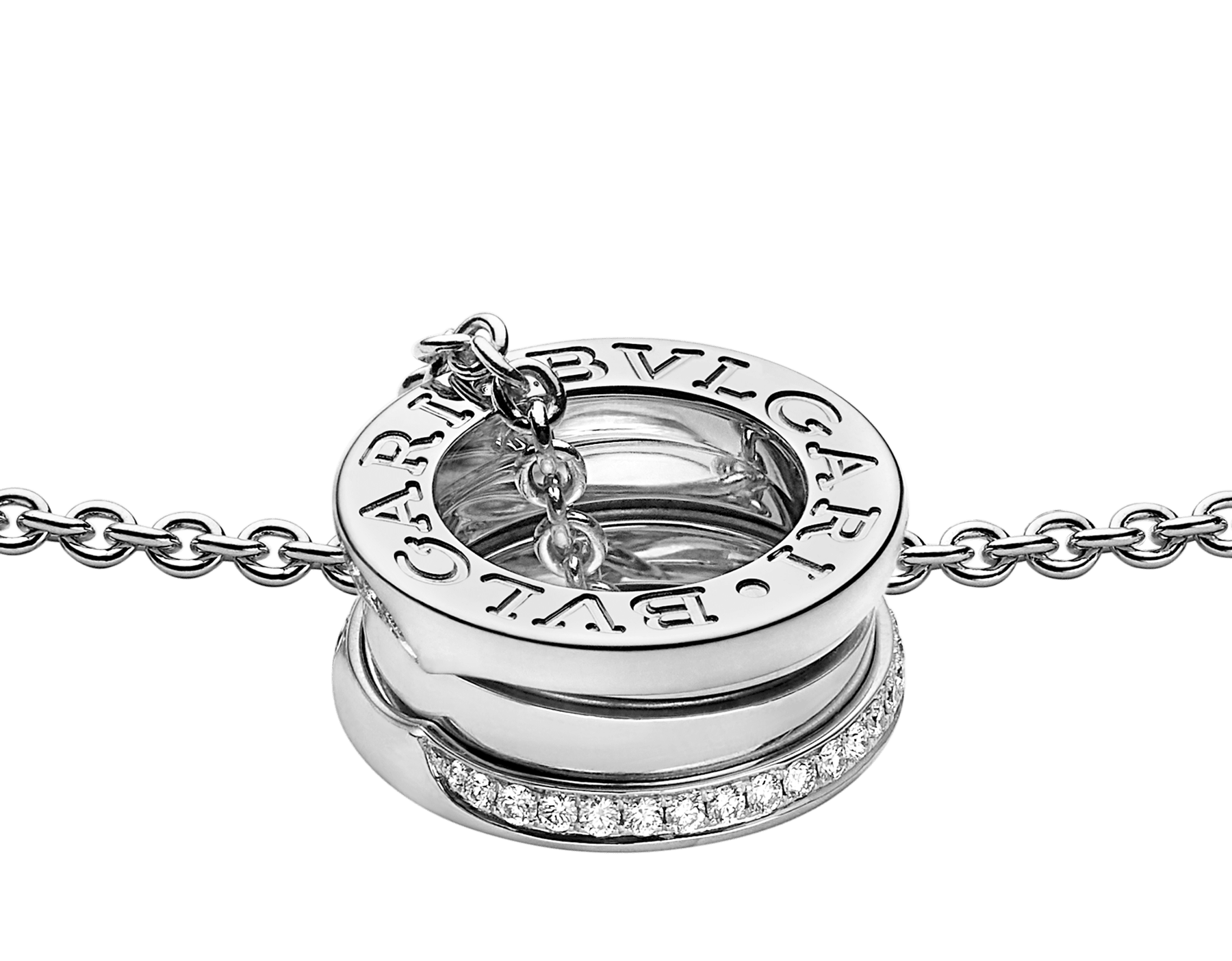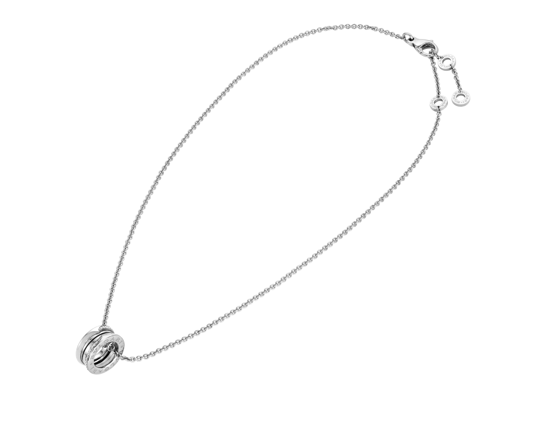 18Kホワイトゴールド製ビー・ゼロワン ネックレス。世界でもっとも有名な円形競技場コロッセオからインスピレーションを得て、ブルガリの創造的ビジョンのこれまでにない画期的な表現を生み出します。 未来を祝福するために誕生したこの大胆なペンダントヘッドには、エッジにデミパヴェダイヤモンドがあしらわれ、その独特のスパイラルが新たな始まりの力を象徴します。