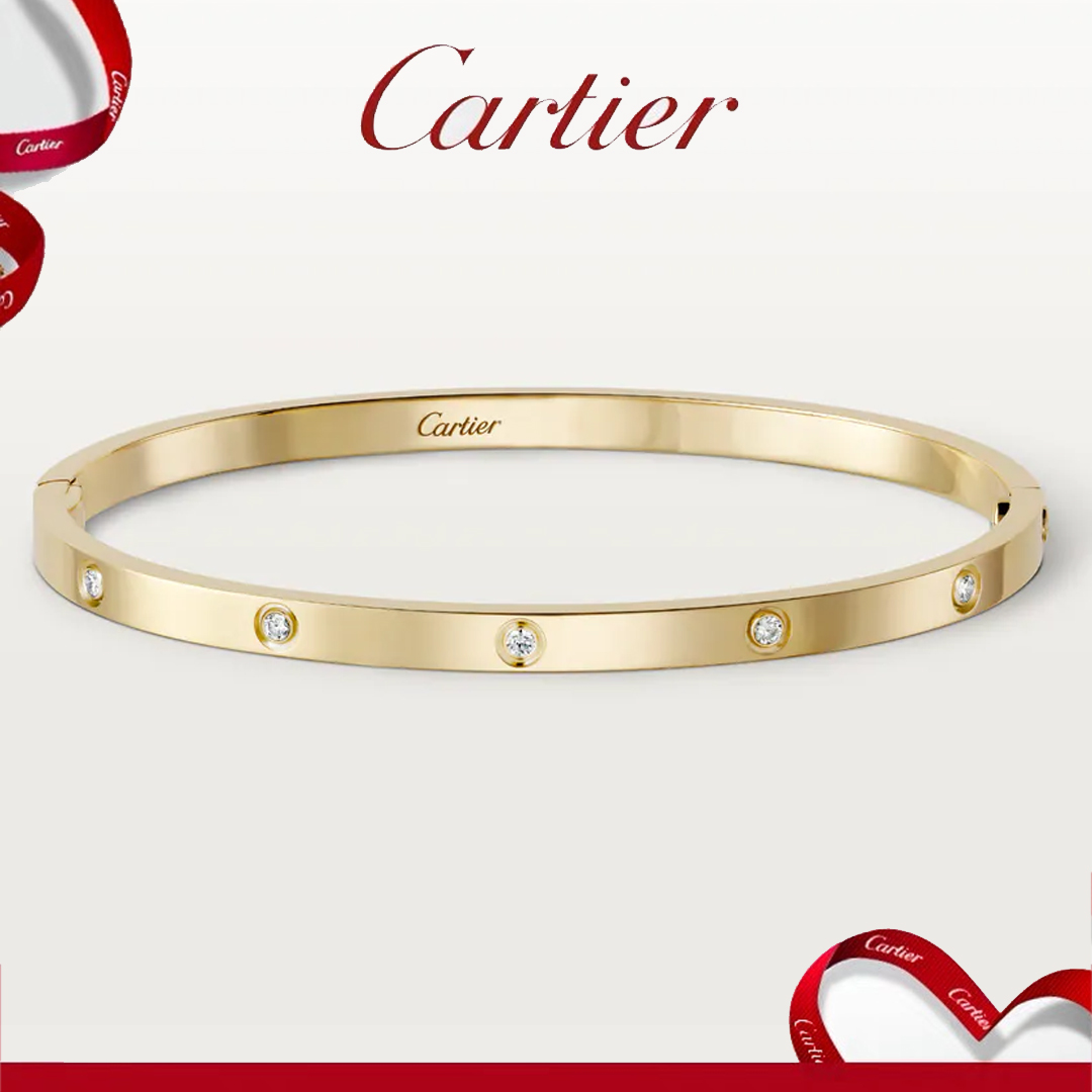 Love ブレスレット、スモールモデル、イエローゴールド750/1000、ブリリアントカット ダイヤモンド10個(計0.21ct)。スクリュードライバー付き。幅:3.65mm(サイズ:17)。アイコニックなLove ブレスレットは、1969年の発表以降、自由な Love のシンボルであり続けています。ビスモチーフと有名なロックシステムがタイムレスなデザインを象徴する一方、オーバルなフォルムは手首にしっかりと、しかしながら心地よくフィットします。ロックシステムの要となっているのは、ブレスレットの両側にある2つの機能的なビスです。Love ブレスレットには専用のスクリュードライバーが付属しており、ブレスレットを身に着けるときにはサポートが必要となります。ご自身に合ったLove ブレスレットのサイズは、カルティエのブレスレット サイズ表でご確認ください。ぴったり着用される場合は1cm、ゆったり着用される場合は2cm追加してください。