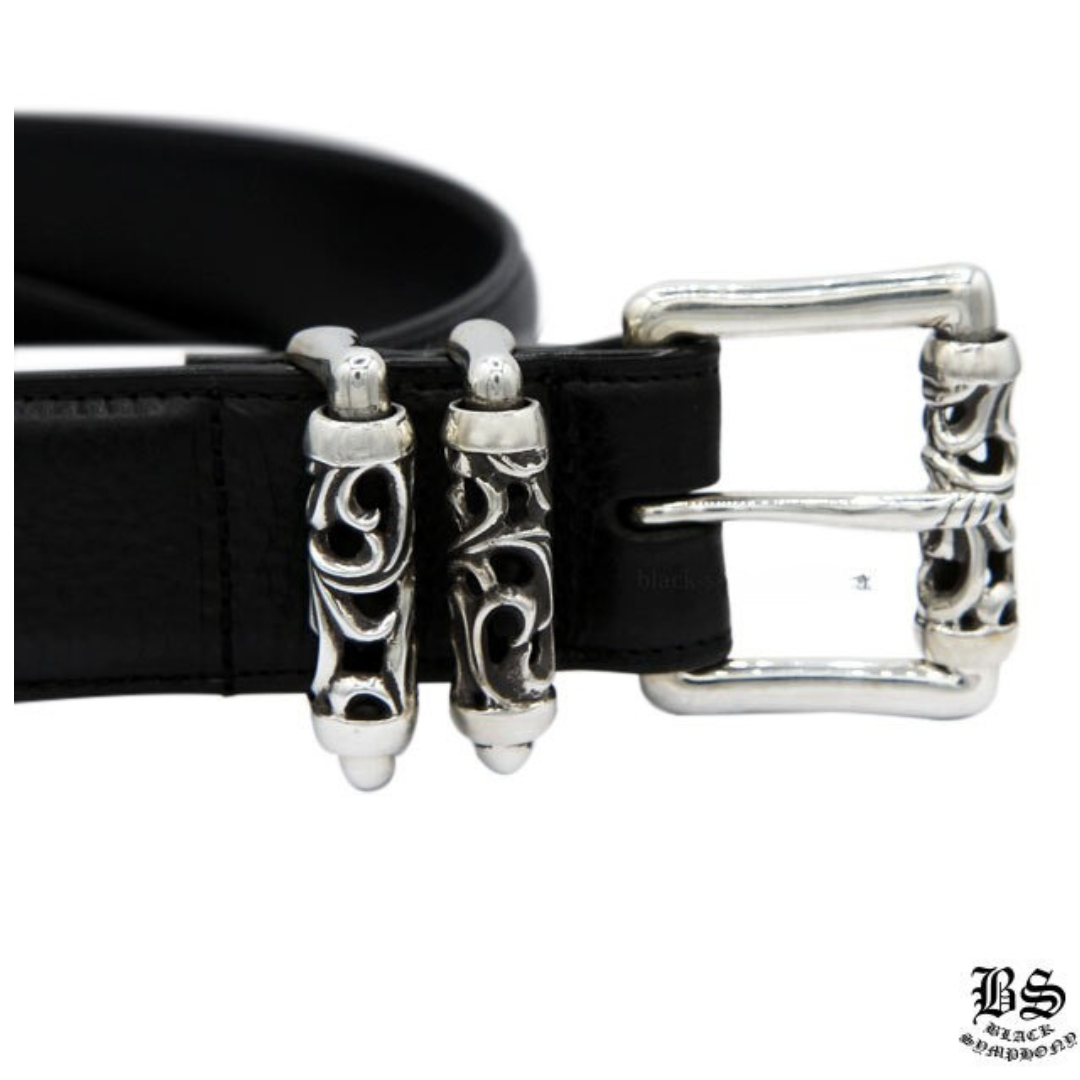クロムハーツの3ピースローラベルトは、その卓越した職人技が光る商品です。このベルトは、立体感ある唐草模様のシルバー細工が施されており、ローラーが回転いたします。一目でその精巧さと美しさに魅了されます。シルバー部分の繊細な唐草模様は、まるで生きているかのような動きを感じさせ、持つ者のファッション性と個性を際立たせます。