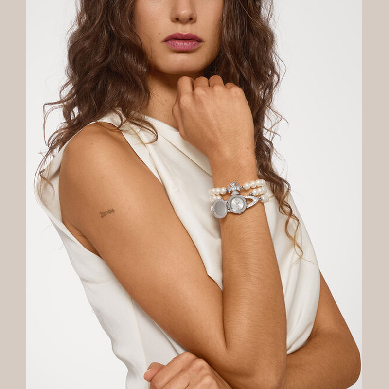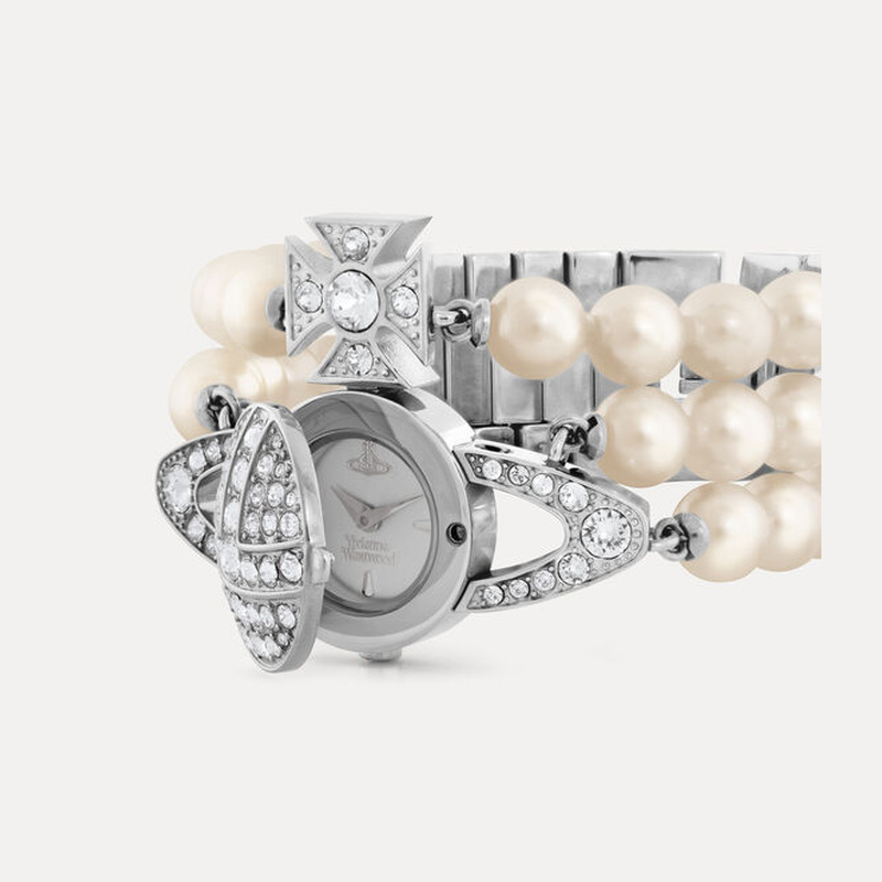 ストランドウォッチは、スワロフスキー製ガラスパールを3連にあしらったブレスレットと、中央に配置されたオーブ型ケースが特徴の、豪華なデザインの腕時計です。ケースにはスワロフスキークリスタルが飾られています。ロンドンの象徴的なシアター地区「ストランド」にちなんで名付けられたこのウォッチは、サテン仕上げのサンレイダイヤルと、専用のスイス製ムーブメントを備え、シルバートーンの金具で仕上げられています。